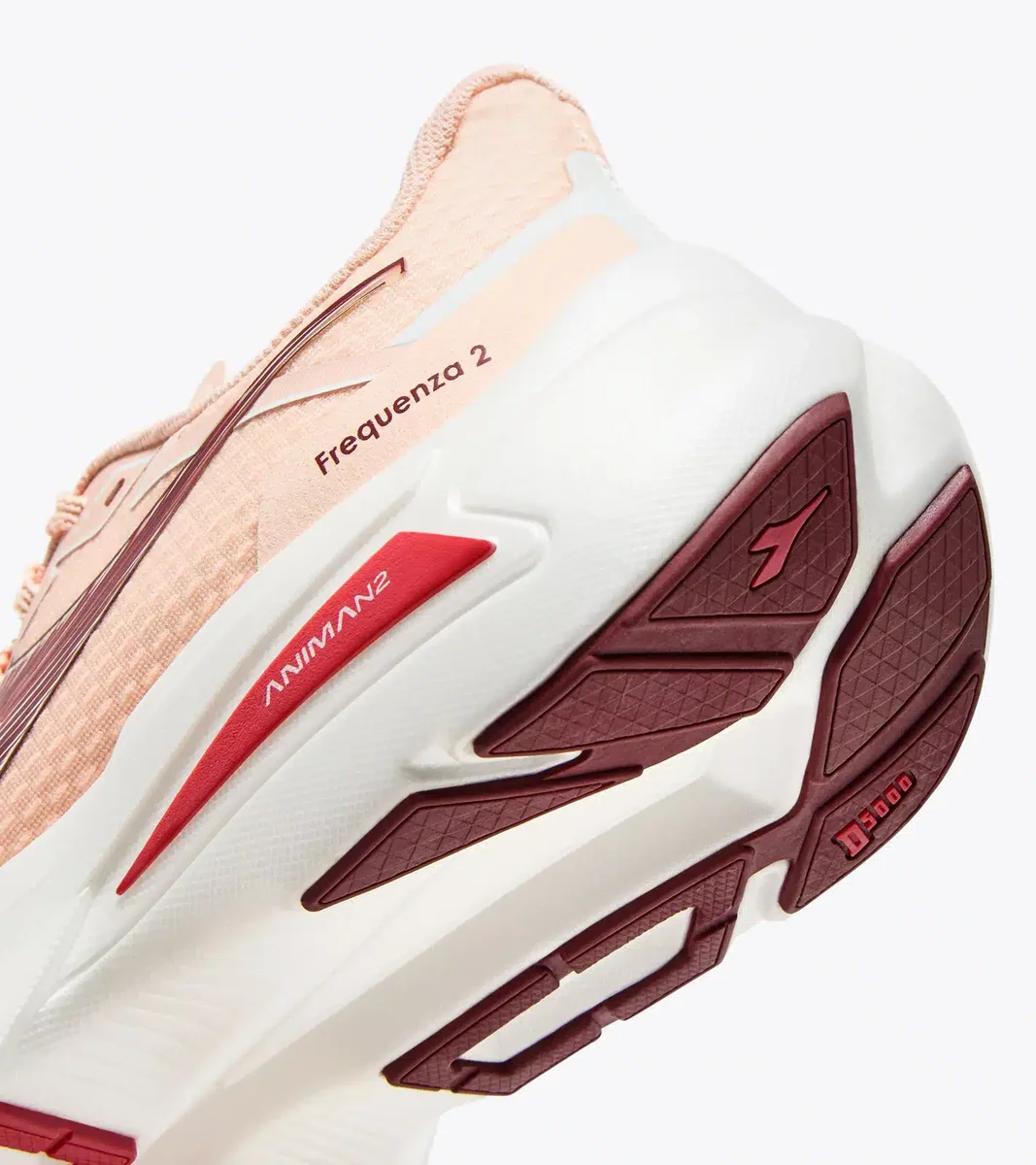 Légère et ultra-réactive, la Frequenza, qui ne pèse que 230 grammes, offre une propulsion similaire à celle des chaussures équipées d’une plaque en carbone. Les tests montrent un taux de rebond impressionnant de 72 %. Avec un drop de 8 mm, elle est conçue pour les coureurs qui recherchent un amorti supérieur, un design ultra-léger et une réactivité immédiate. Entraînements rapides et courses de tempo Pour les entraînements rapides et les courses sur de courtes distances, 5 ou 10 km. Technologie Anima N2 Anima N2 est la nouvelle technologie Diadora en EVA SCF (Super Critical Foaming) qui augmente le rebond de la semelle intermédiaire de 40 %, tout en réduisant son poids de 40 %. Rebond extrême. Rebond total de 72 %, propulsion comparable à celle des chaussures à plaque en carbone. Tige redessinée.