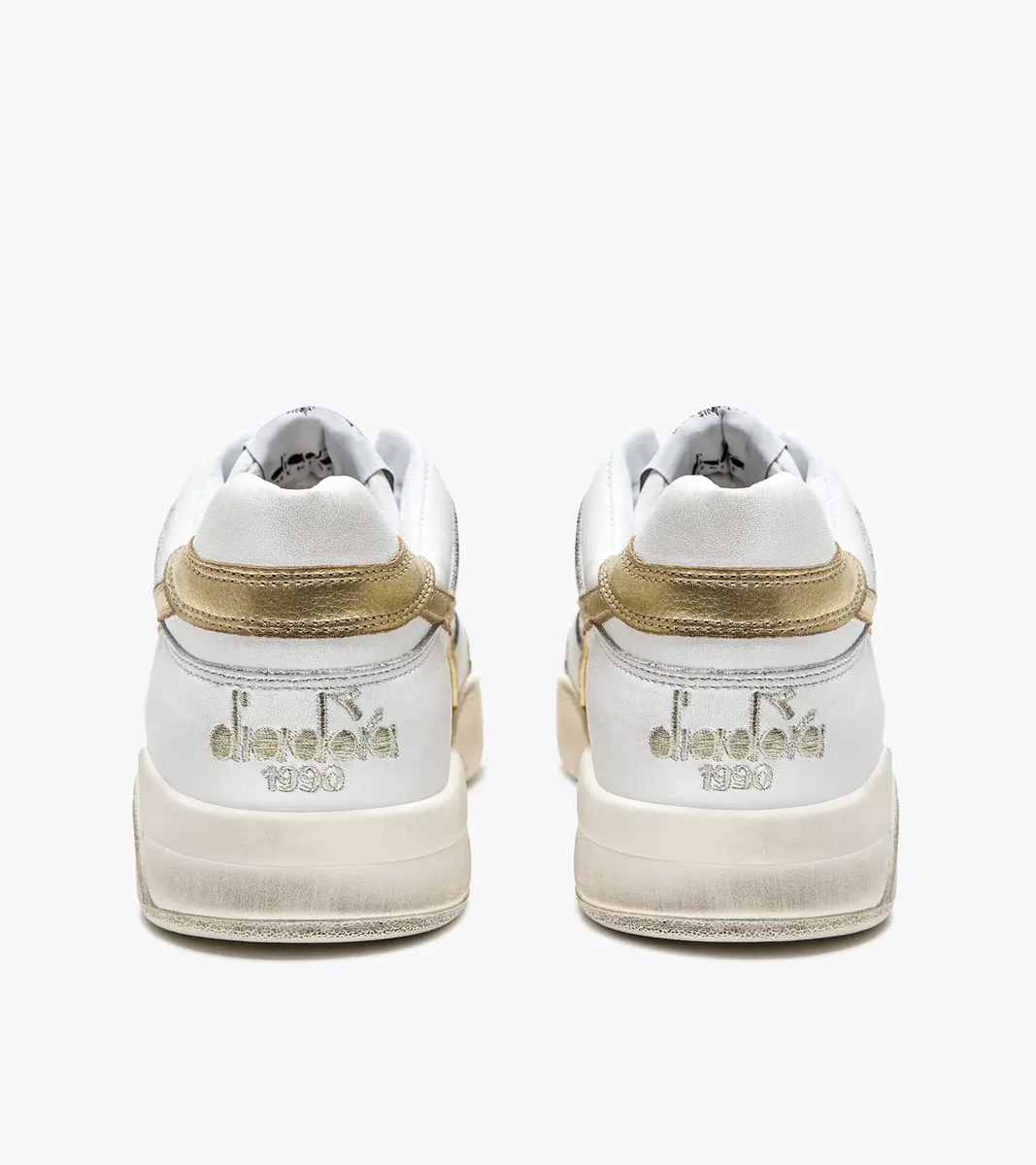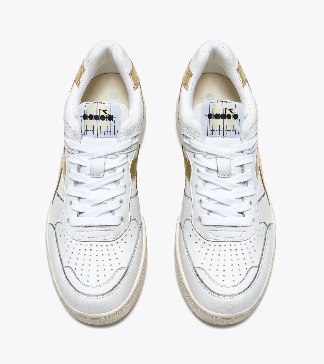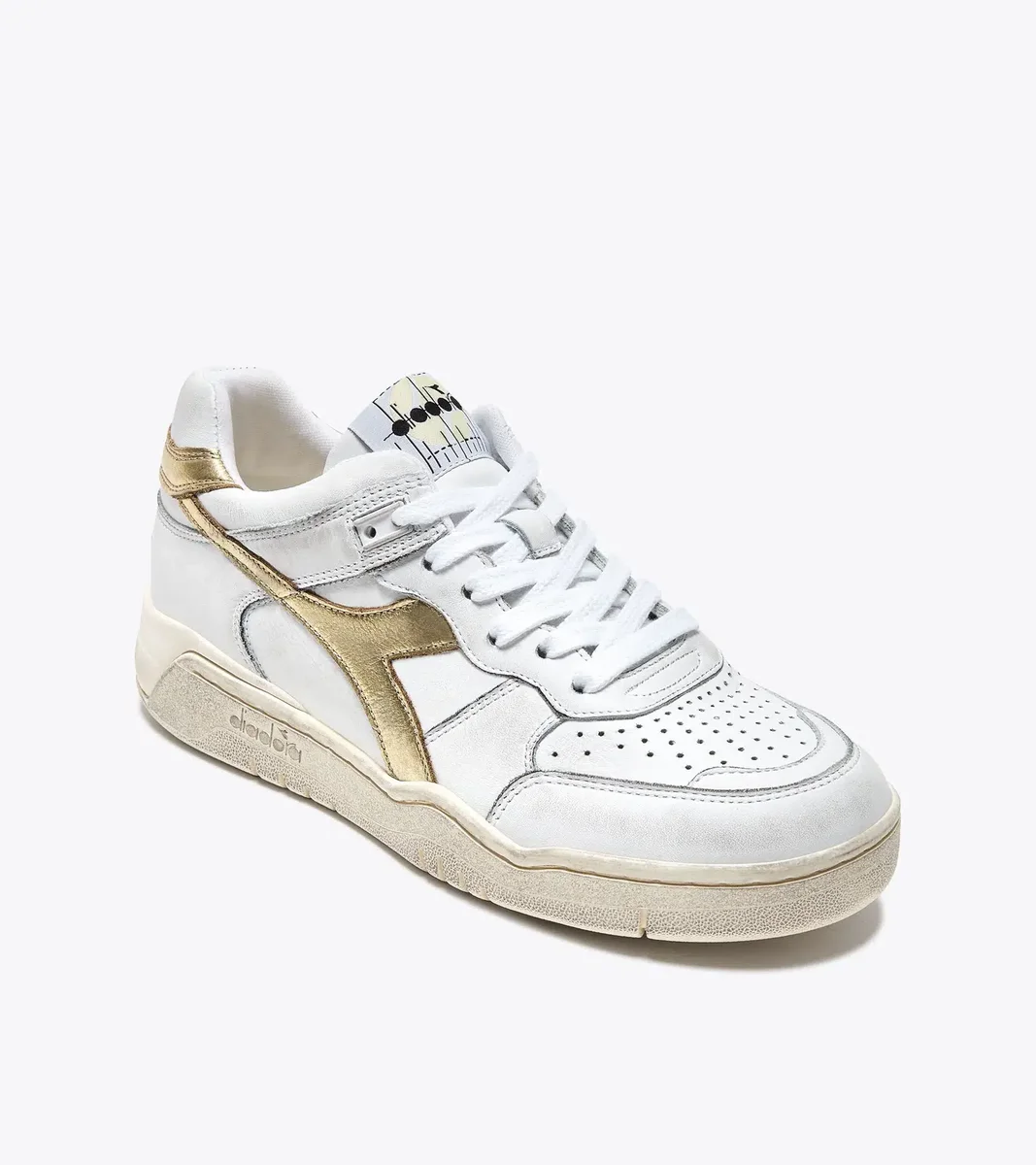 Certains disent que les baskets sont plus belles lorsqu’elles ont été portées, mais il y a la B.560 Laminated : une finition blanc cassé parfaite dès la sortie de la boîte, obtenue grâce à un léger cirage. Cette finition met en valeur la qualité de la tige en cuir pleine fleur et s’harmonise à merveille avec le logo en cuir laminé doré.