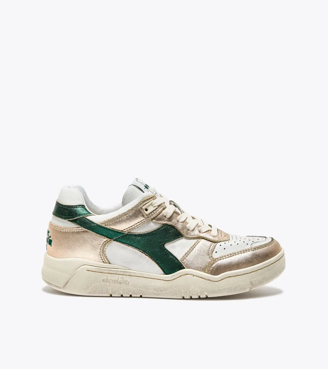 Détail typique des sneakers Diadora Heritage, le délavage à la pierre adoucit le cuir