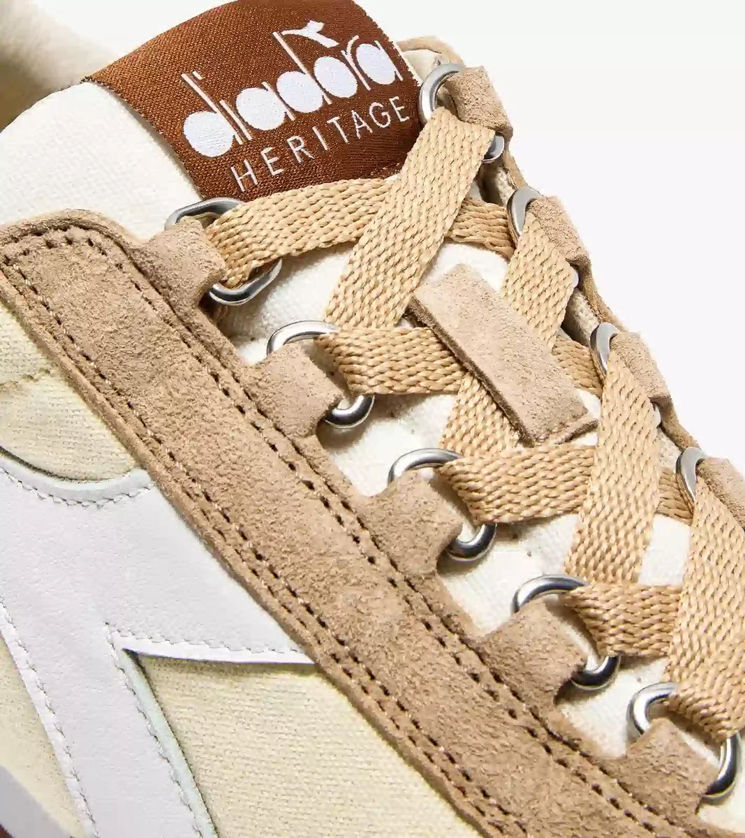 Détail caractéristique des baskets Diadora Heritage, le traitement de lavage à la pierre adoucit le cuir.