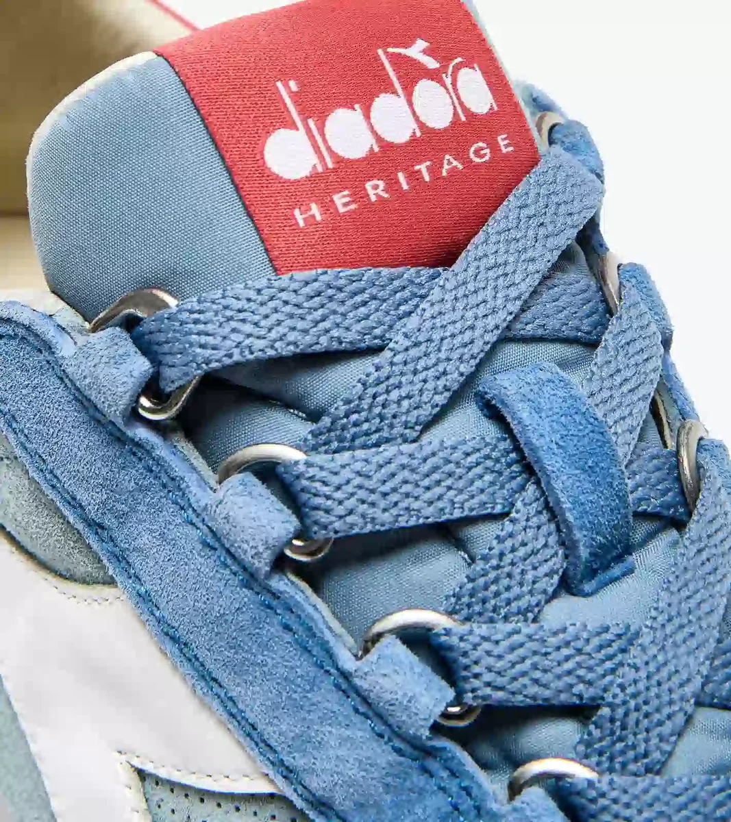 Détail typique des baskets Diadora Heritage, le traitement délavé à la pierre adoucit le cuir.
