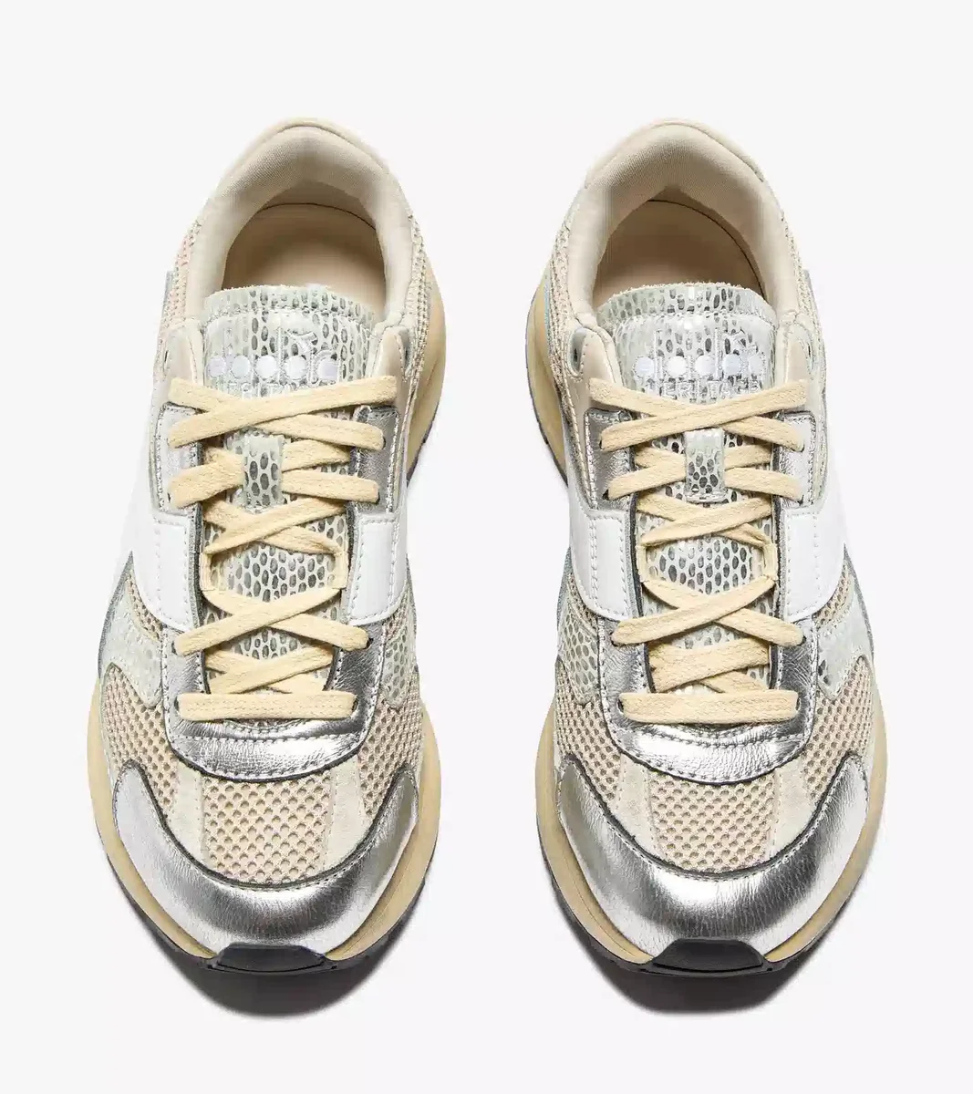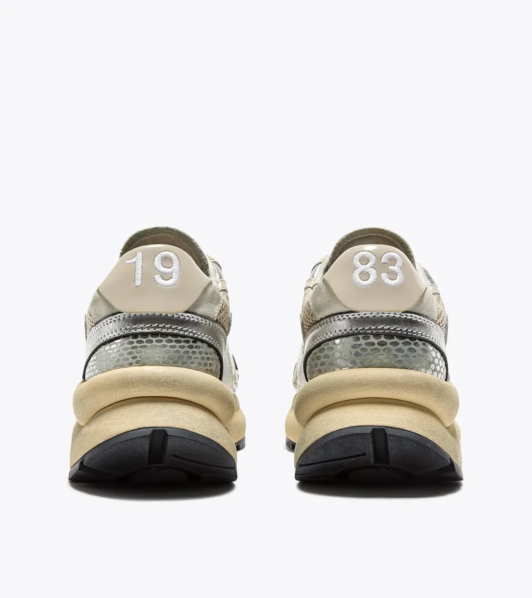 La maille ultra-légère brille d’un fini brillant, tandis que le cuir métallisé arbore un motif serpent audacieux qui attire l’attention. Traitées avec un lavage à la pierre et de la cire, ces baskets sont conçues pour satisfaire votre envie de style sportif classique des années 70.