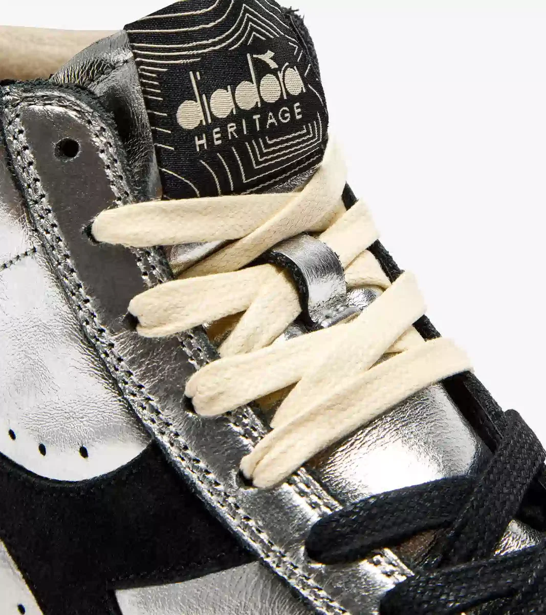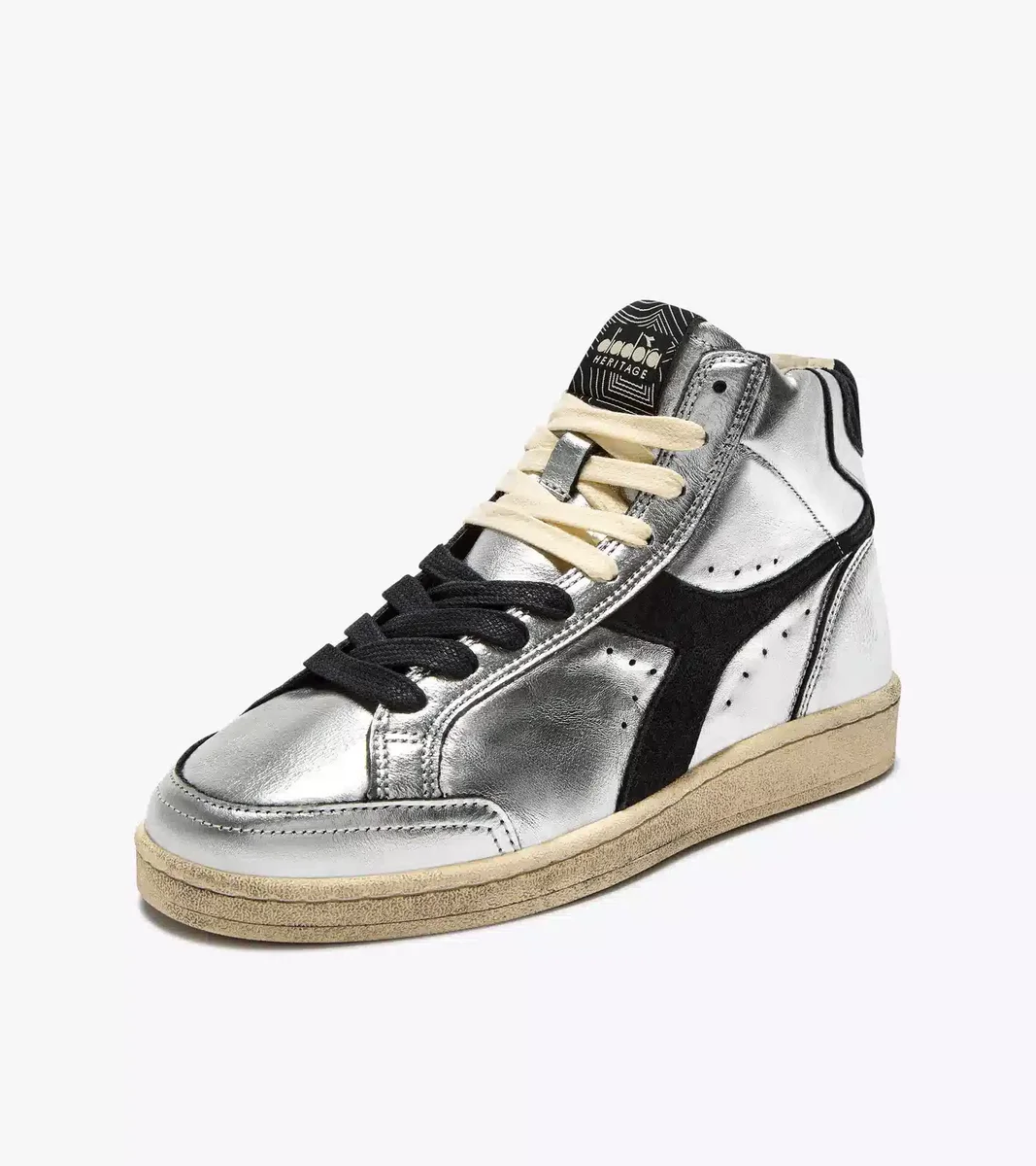 La Prestige High Metal Used est fabriquée en cuir laminé avec des détails en cuir de porc. Le traitement stonewashed adoucit les matériaux, tandis qu’une légère finition cirée donne à la chaussure son aspect usé incomparable, signature de la ligne Diadora Heritage.