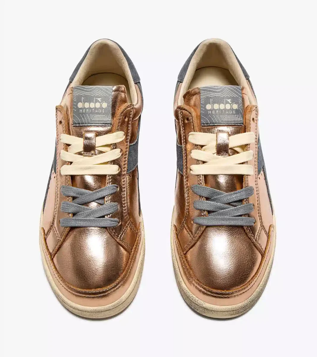 La Prestige Metal Used est fabriquée en cuir laminé avec des détails en cuir de porc. Le traitement délavé adoucit les matériaux, tandis qu’une légère finition cirée donne à la chaussure son look usé incomparable, signature de la ligne Diadora Heritage.
