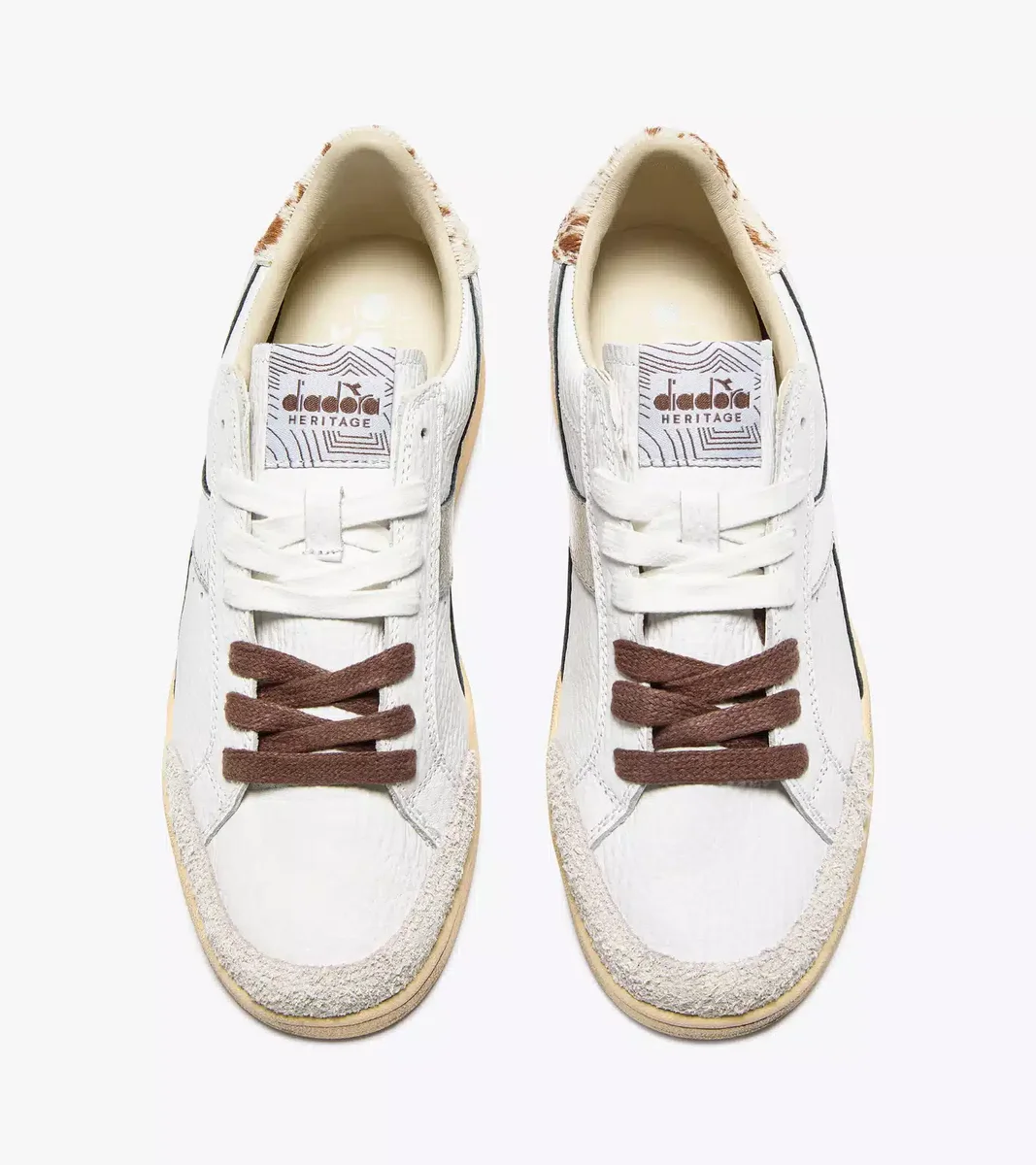 La Prestige Safari WN se distingue par son talon orné de détails animaliers en cuir de cheval, qui contrastent parfaitement avec le logo laminé brillant. Une légère finition cirée lui confère cet aspect usé caractéristique, signature exclusive des baskets Heritage.