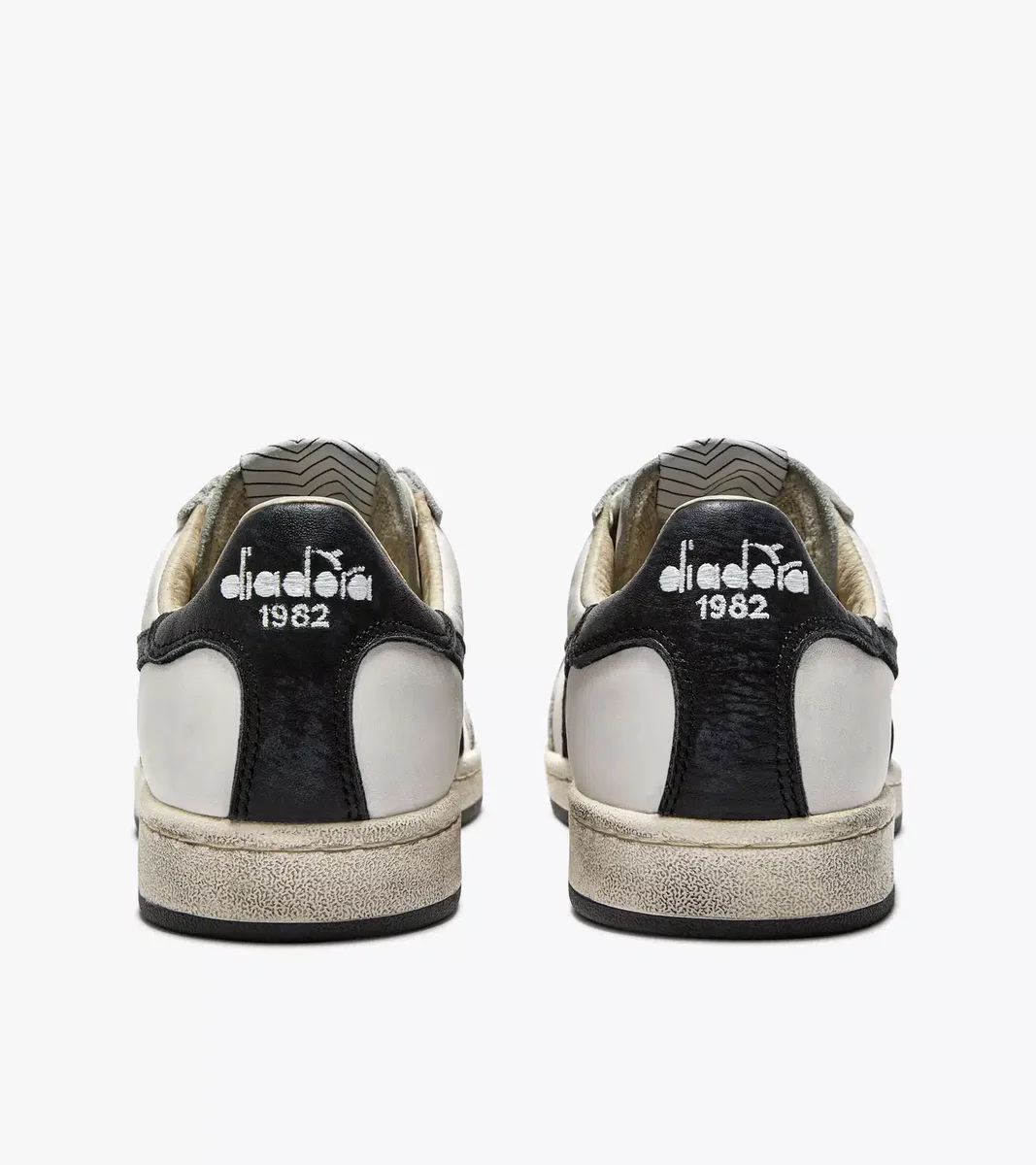 Prestige Used est fabriqué en cuir avec des détails en daim de vachette. Le traitement délavé adoucit les matériaux, tandis qu’une légère finition cirée donne à la chaussure son aspect usé caractéristique, signature de la ligne Diadora Heritage.