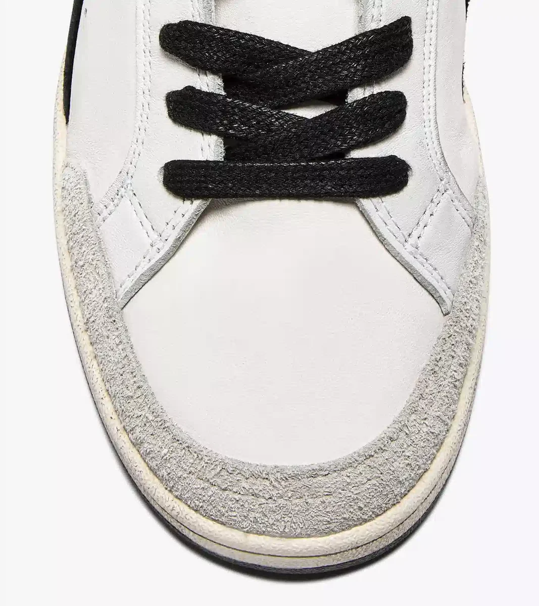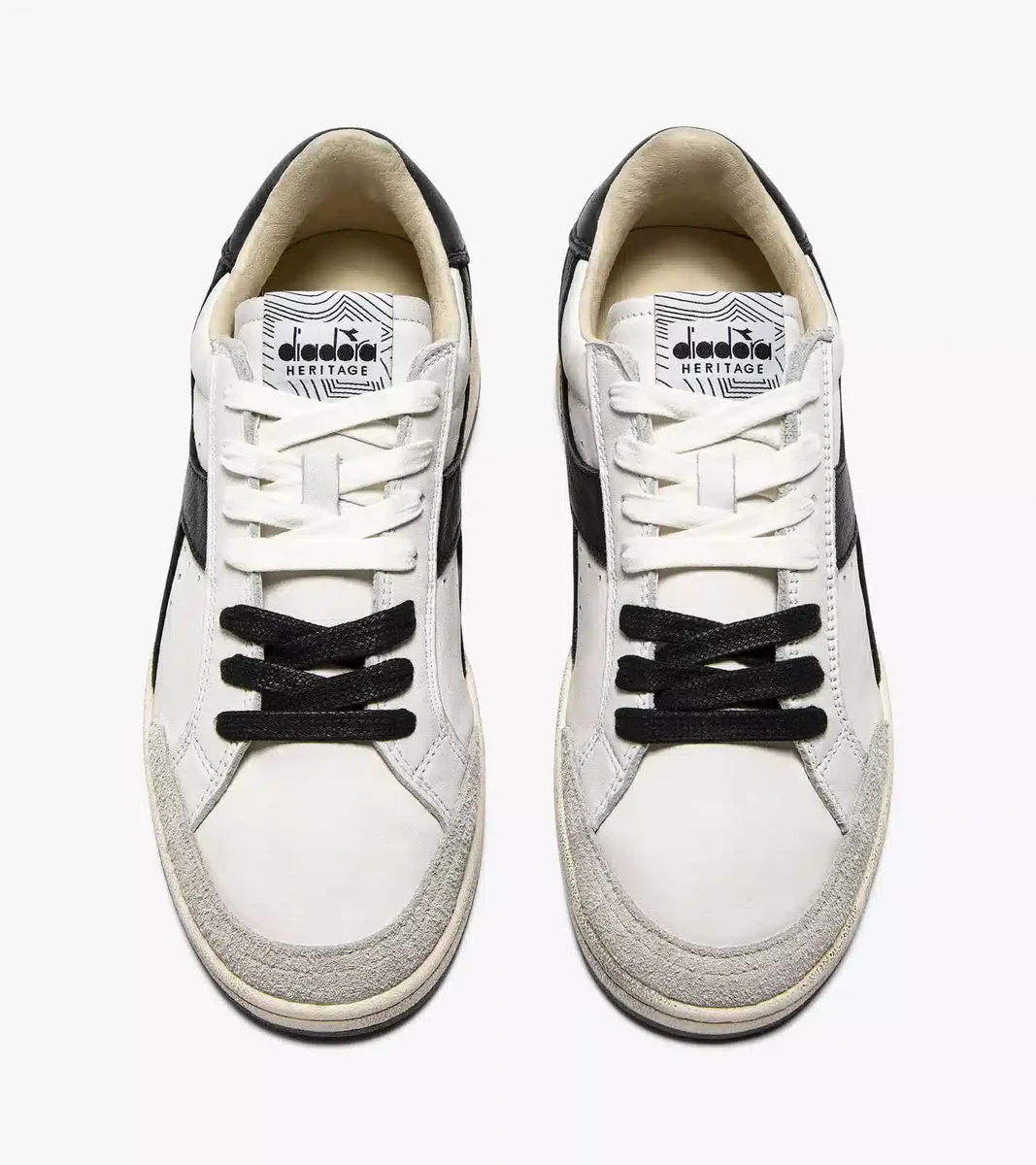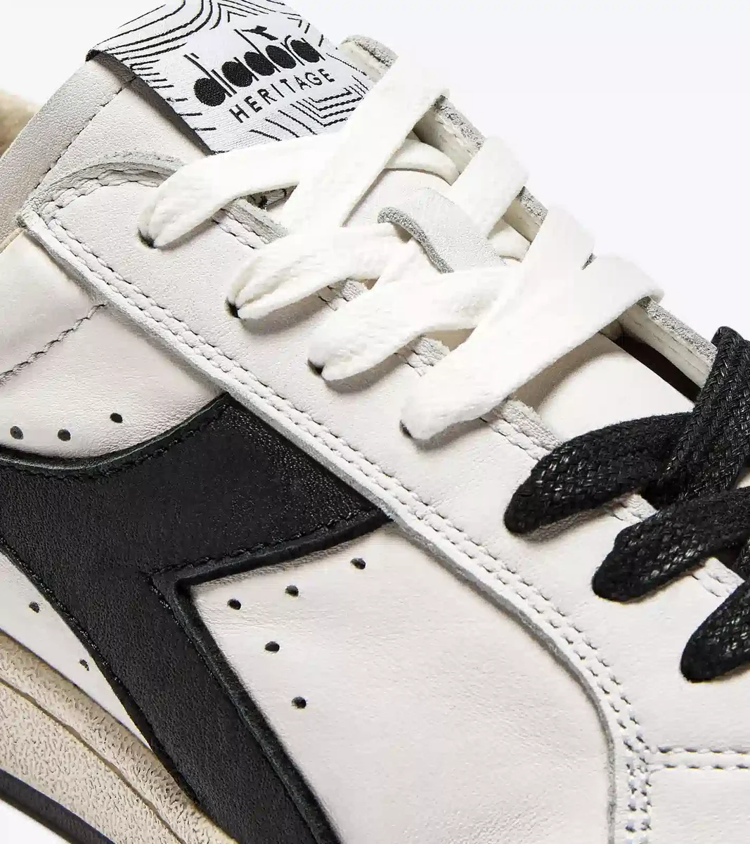 Détail caractéristique des baskets Diadora Heritage, le traitement délavé adoucit le cuir