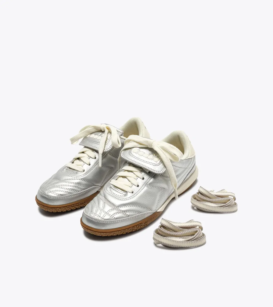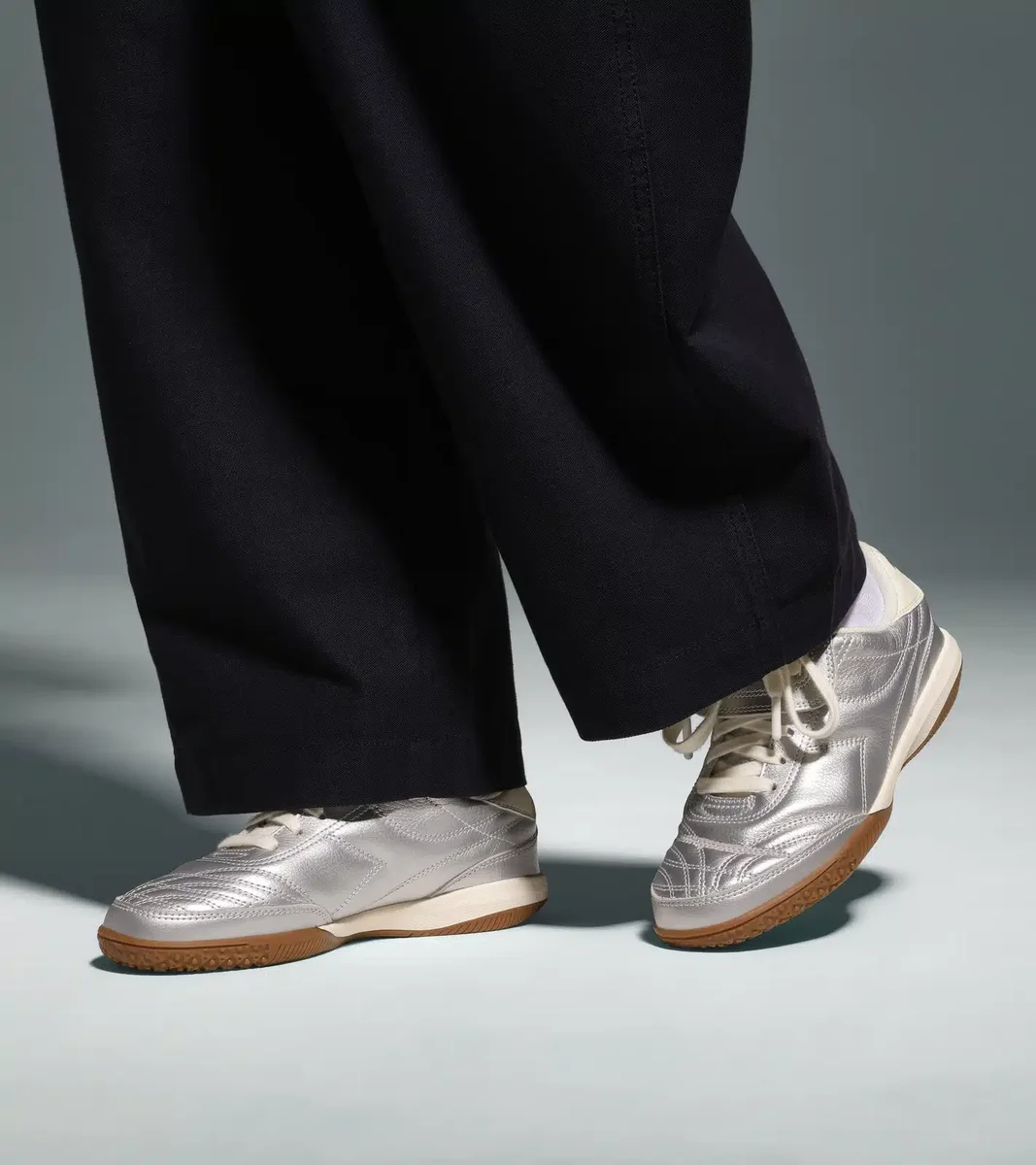 Gold Indoor Metallic fait entrer le style terrasse dans les années 2000 avec des tons métalliques audacieux et une tige entièrement en cuir laminé. Cette version emprunte la languette rabattable des chaussures de football classiques pour un look raffiné et inspiré du sport. Et la semelle en gomme signature, directement issue des archives de handball de Diadora, est ce détail que vous aimez depuis les années 80.