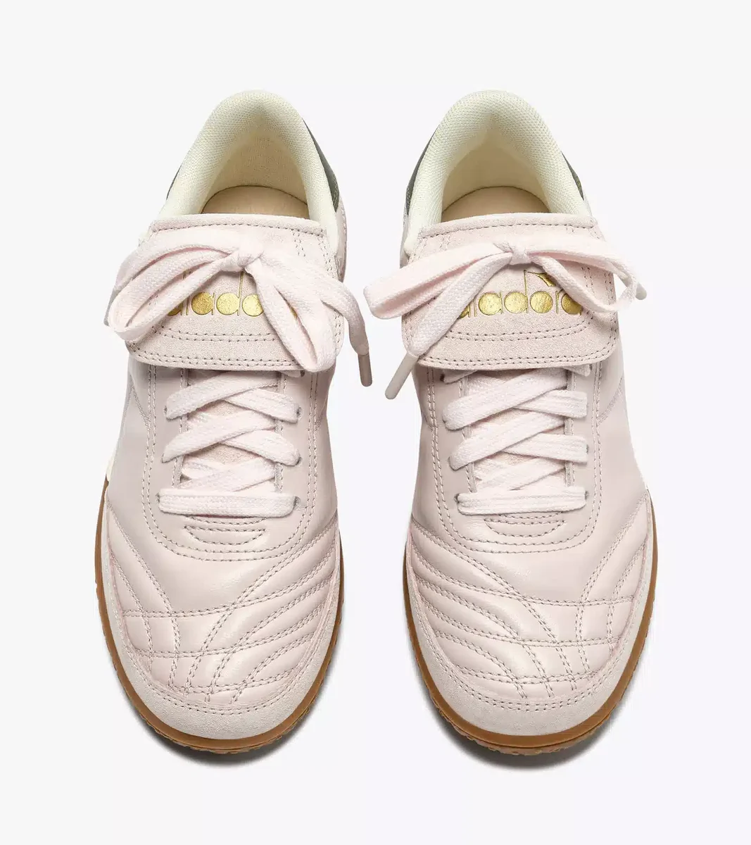 La Gold Indoor Metal est fabriquée en cuir souple et en cuir de porc. Pour être à la hauteur de son nom, nous avons ajouté une languette arrière en cuir laminé contrasté sur la tige aux tons pastel.
