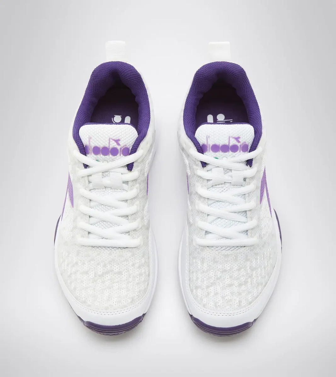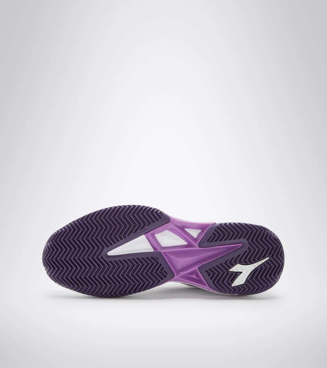 Chaussure de tennis pour femme dotée d’une semelle intérieure anatomique amovible en tissu et en EVA expansé antichoc. La tige est tricotée avec un transfert TPU transparent, tandis que la semelle en caoutchouc avec un composé spécial Duratech 5000 résistant à l’usure est parfaitement adaptée aux surfaces en terre battue.