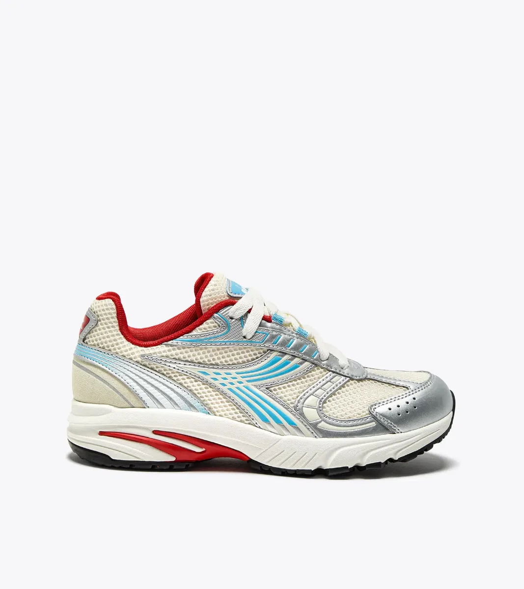 Tous les éléments du style de course à pied des années 2000 : tige en mesh ouvert, design de la semelle intermédiaire et détails argentés