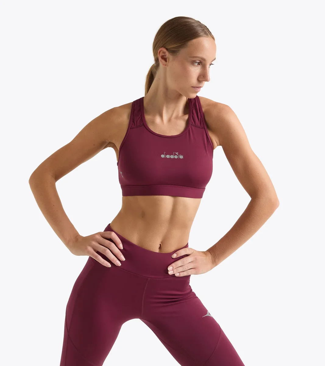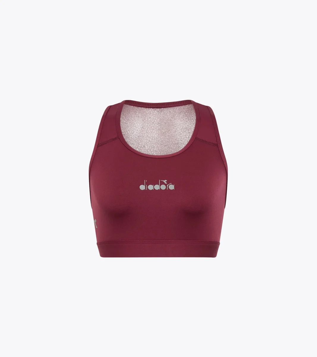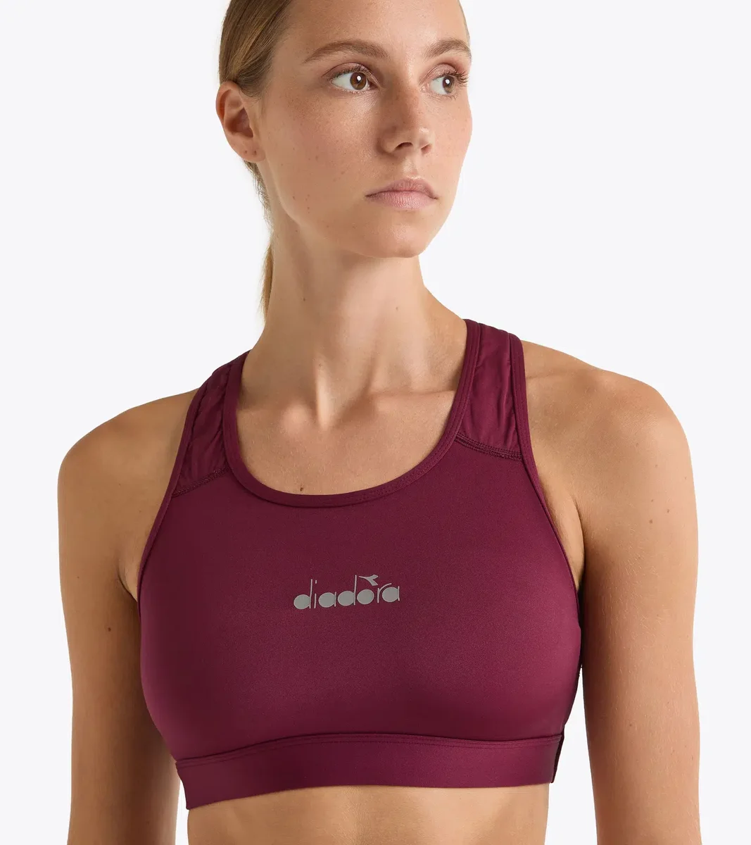 Soutien-gorge d’entraînement en polyamide extensible à haute compression. Dos en maille légère, pour un effet tulle.