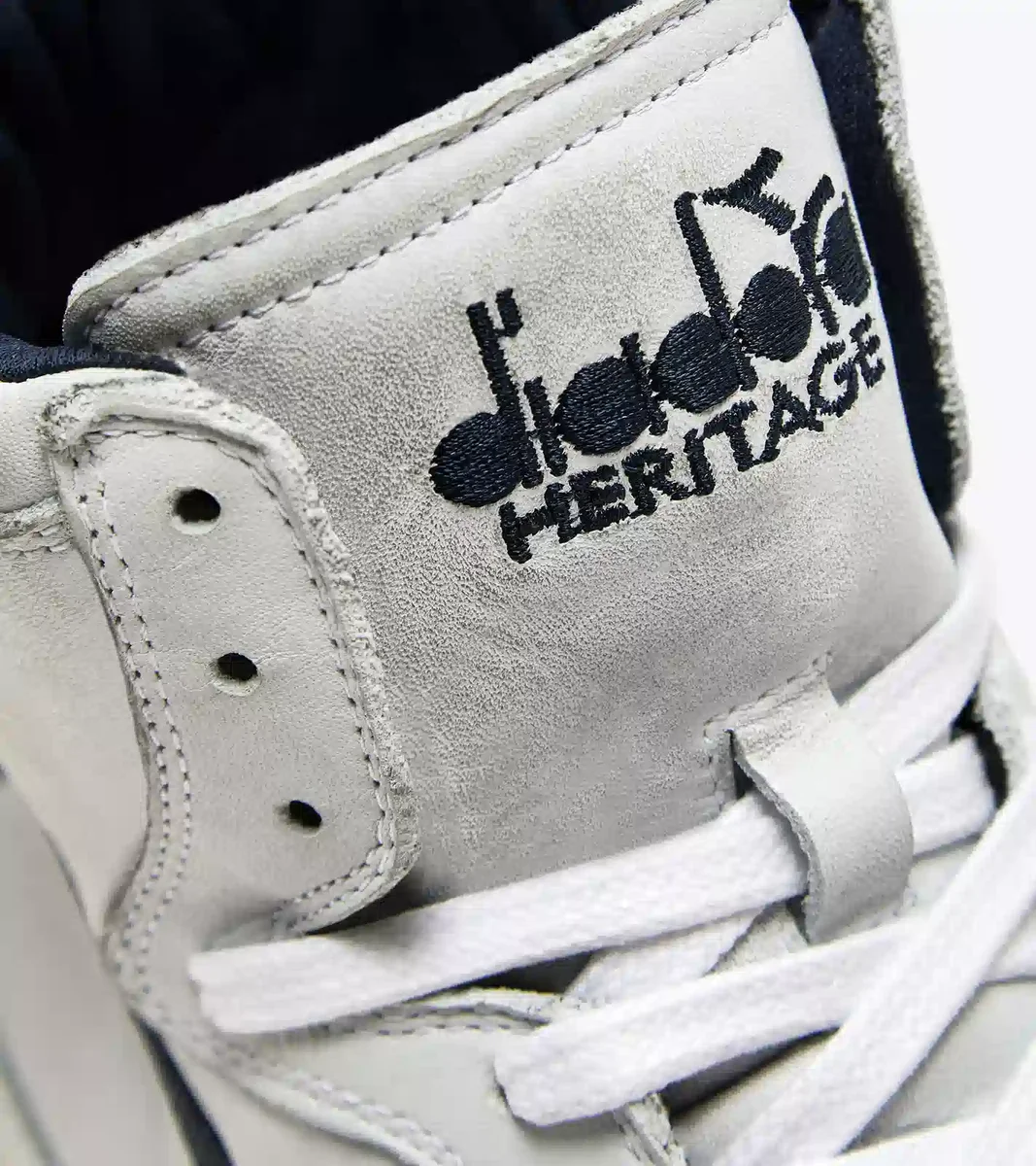 Détail typique des baskets Diadora Heritage, le traitement stone wash adoucit le cuir