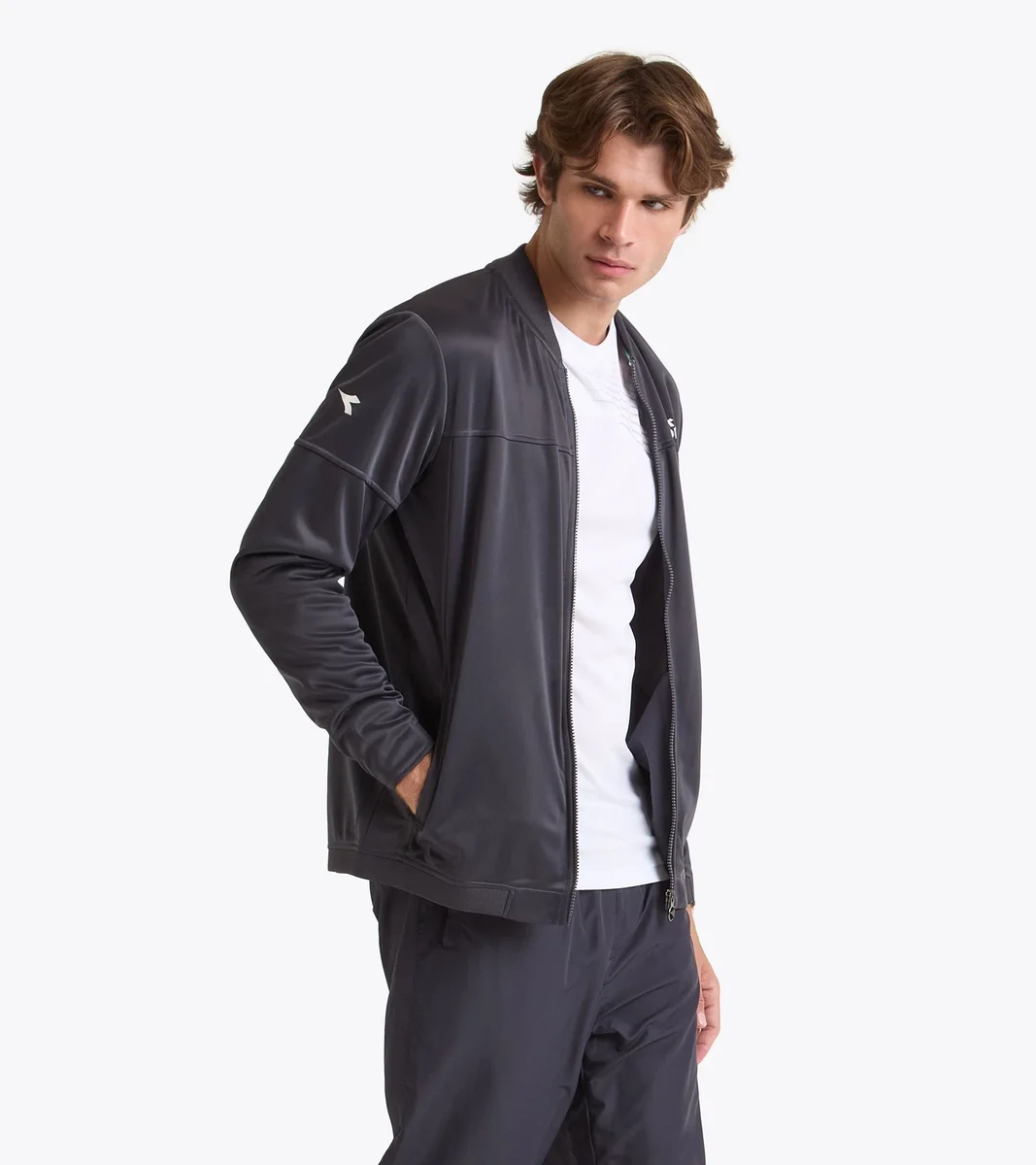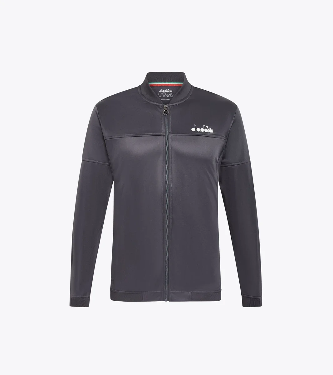 Veste à fermeture éclair intégrale en polyester brillant, détails côtelés aux poignets et à l’ourlet, col style universitaire. Logo Diadora sur la poitrine et fregio sur la manche.